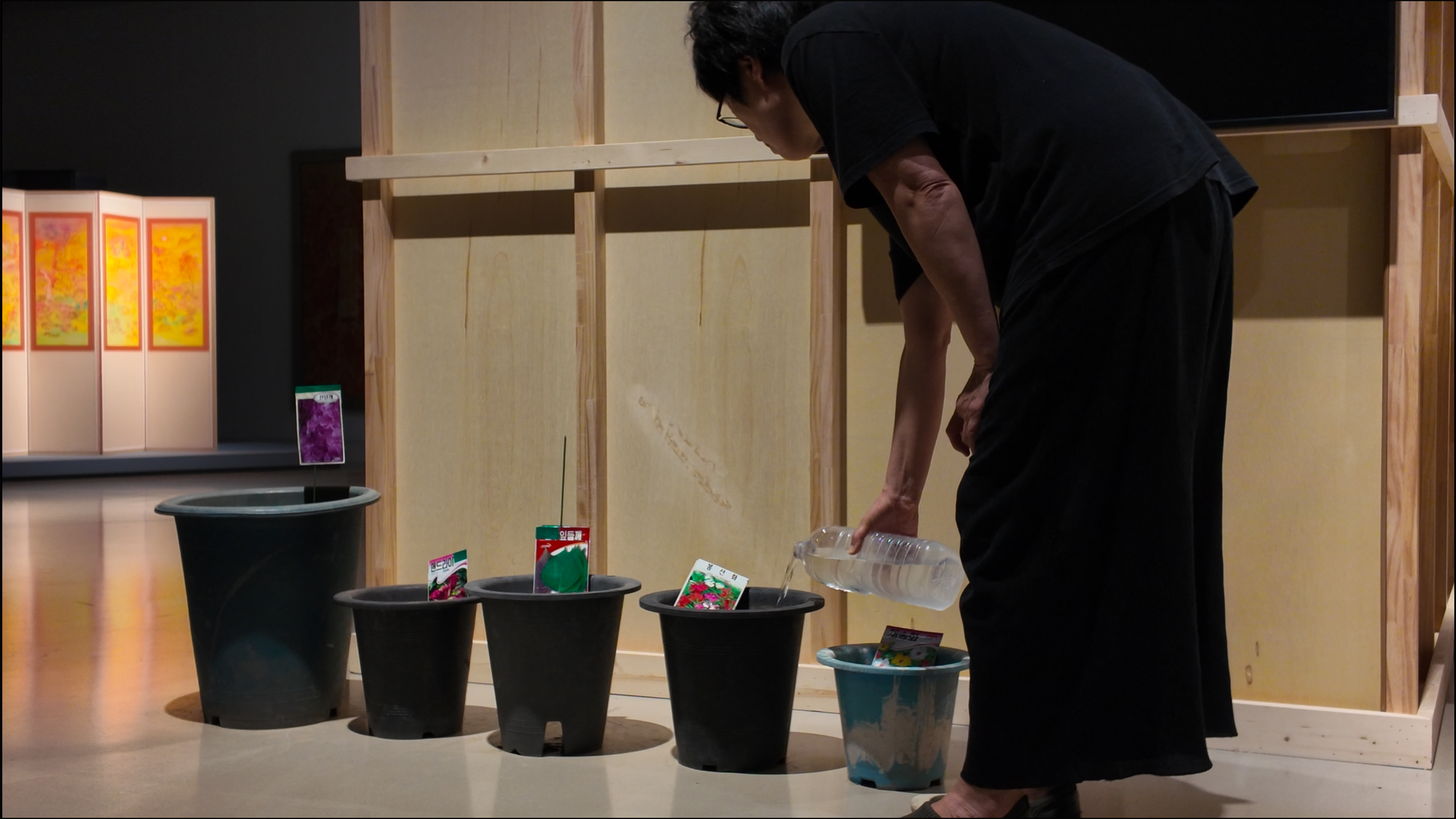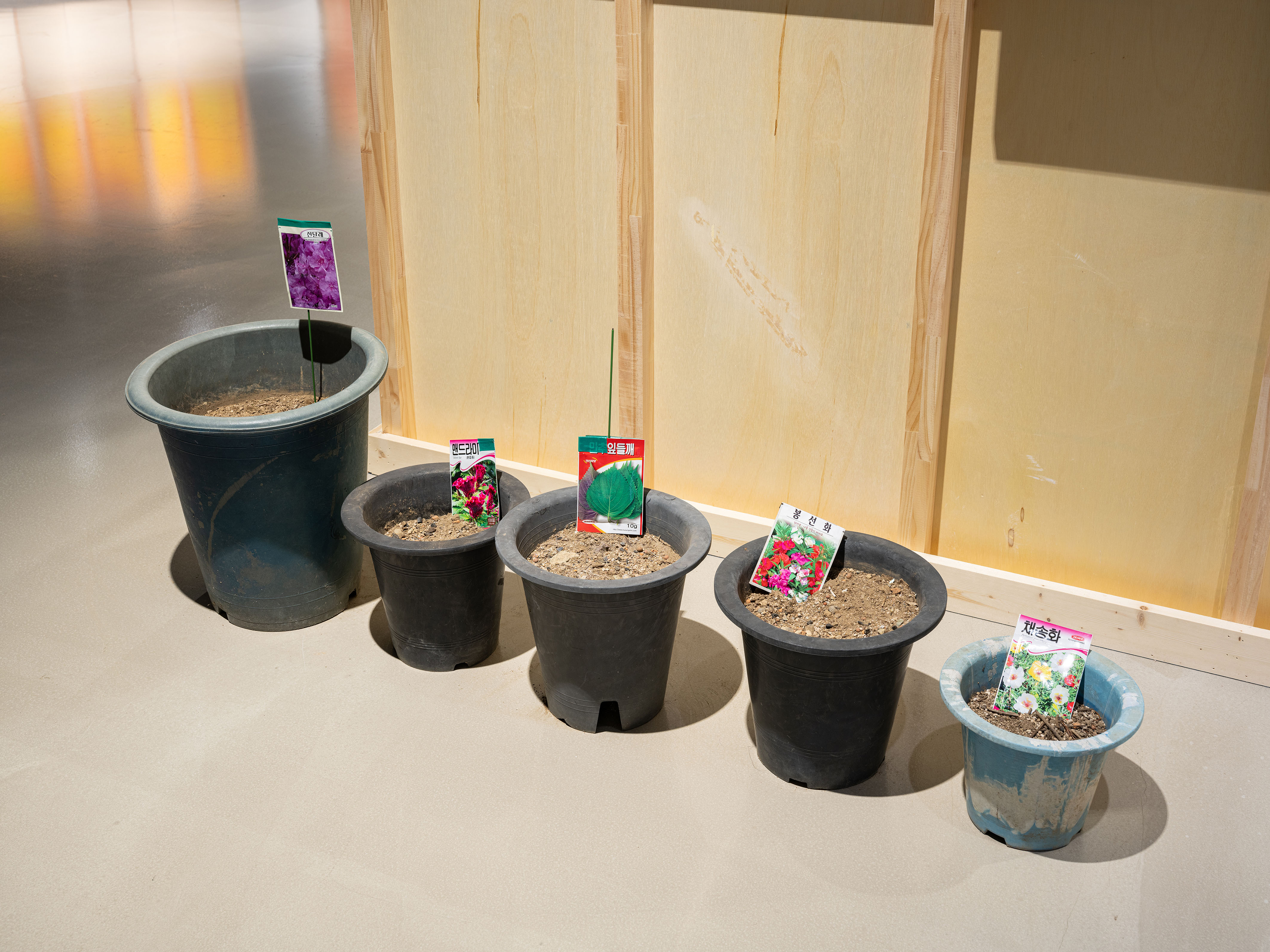 The plant pots Winter Pots with seeds packets placed on the soil, suggest the gesture of sowing. They are ordinary Korean plants, sometimes unavailable in Europe.
